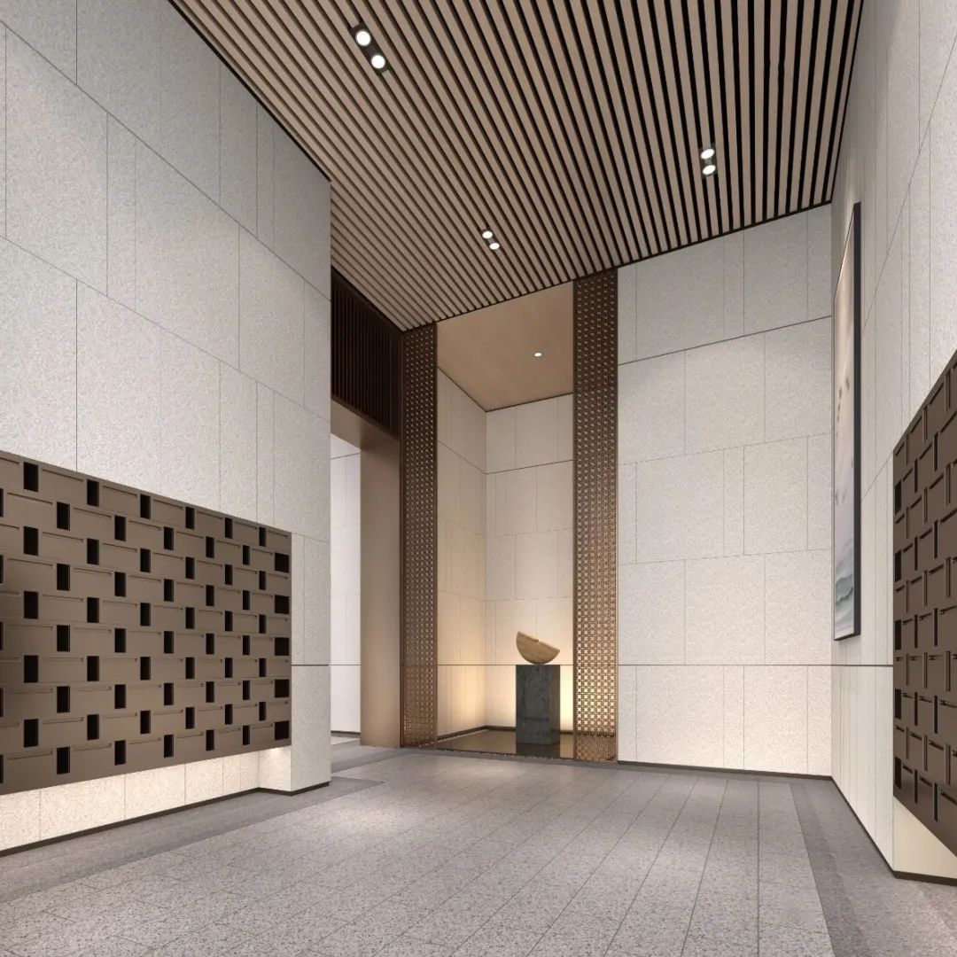 信達(dá)秦禾·金尊府項(xiàng)目設(shè)計(jì)范圍包含樣板間、首層入戶大堂以及架空層,其中入戶大堂采用半開(kāi)放式設(shè)計(jì)和園林相輔相成,外展區(qū)設(shè)置信報(bào)箱、快遞柜等功能空間。考慮到業(yè)主短暫休憩的需求,設(shè)置了休息區(qū)、公告欄以及主題墻等區(qū)域,讓公共空間美觀實(shí)用且具有品質(zhì)感。