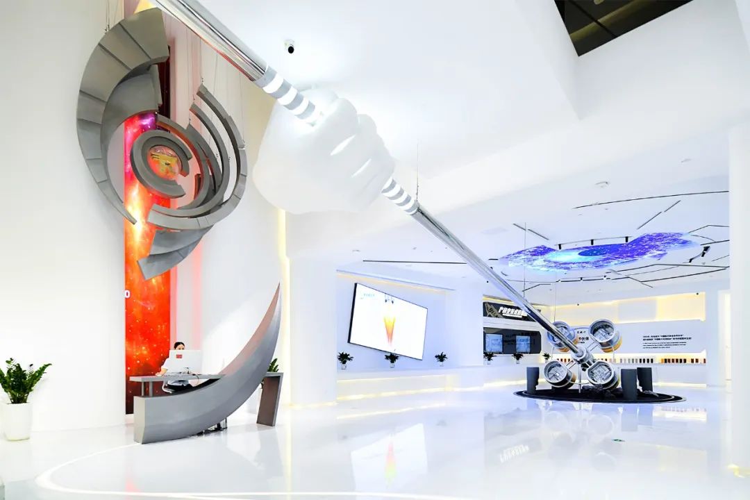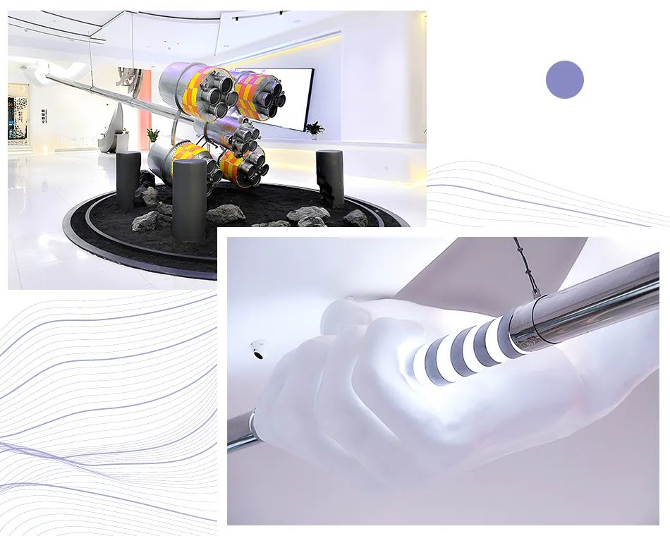 進(jìn)入展廳,一道紅光閃爍-鳳翅和鳴映入你的眼簾 ,造型靈感來源于鳳凰羽毛跟鳳凰之眼,向右順勢看去,一只強(qiáng)有力的拳頭(凱撒大帝之手)從天花伸出,延生過去就是神六之光,3個概念裝置,全部用鋁材制作,造型復(fù)雜,既要保證效果也要考慮安裝跟連接的牢固性,技術(shù)及安裝難度很大。項目部在施工現(xiàn)場一次又一次地嘗試,不斷調(diào)整,確保不出絲毫偏差。