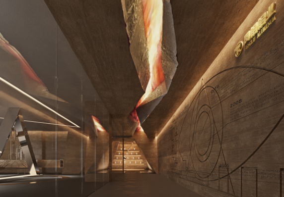 企業(yè)成長是必定經(jīng)歷種種坎坷的,猶如一段“歷天火而開天地”的涅槃艱辛過程。道路上方由火光躍動的LED屏幕與裂開的天花作為序章。天花側(cè)面是鋁材原材剖面藝術(shù)展現(xiàn),空間右側(cè)蝕刻著企業(yè)的大事記,展示著企業(yè)孜孜奮斗的華美篇章。