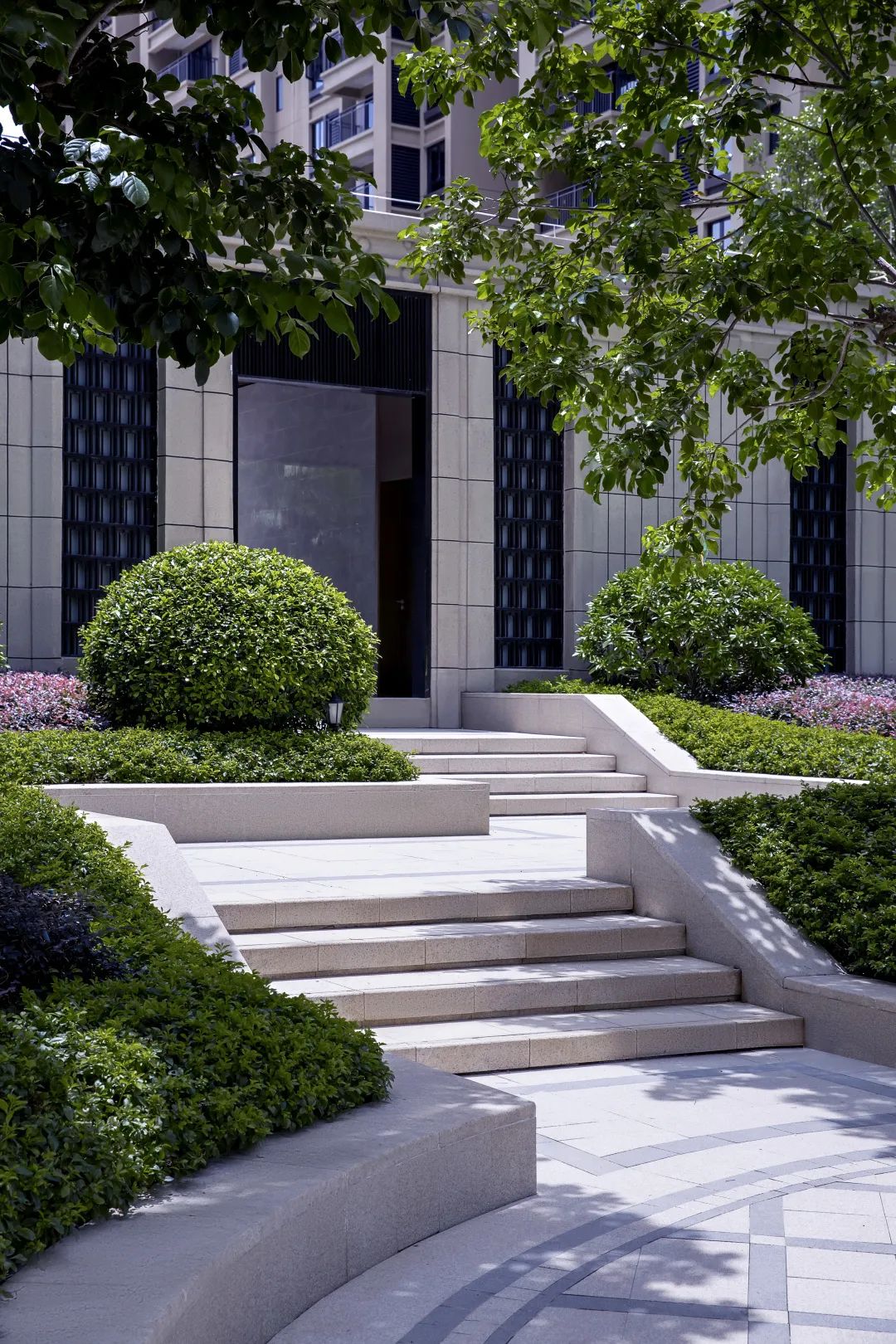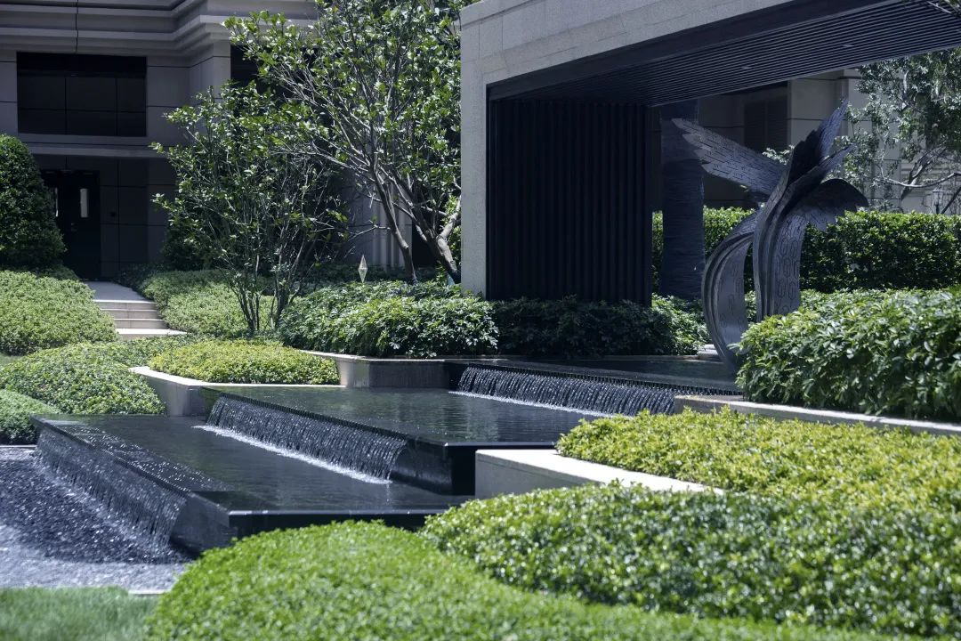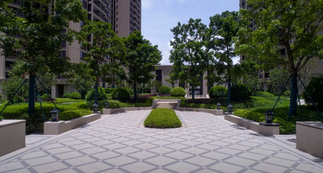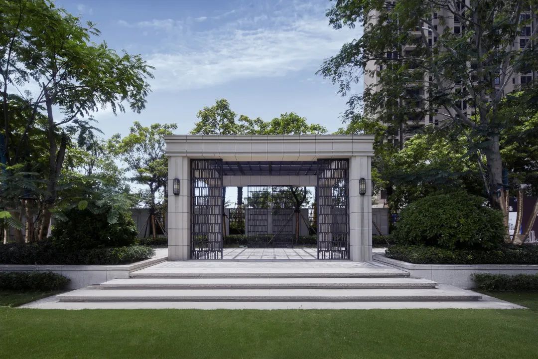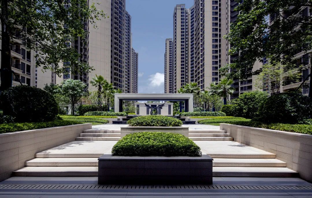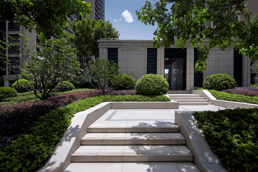 過入口,結合場地高差,設計巧妙利用階梯和整形樹池將禮序延續,階梯消化高差的同時,也為園區增添了神秘感以及歸家的尊享品質感。