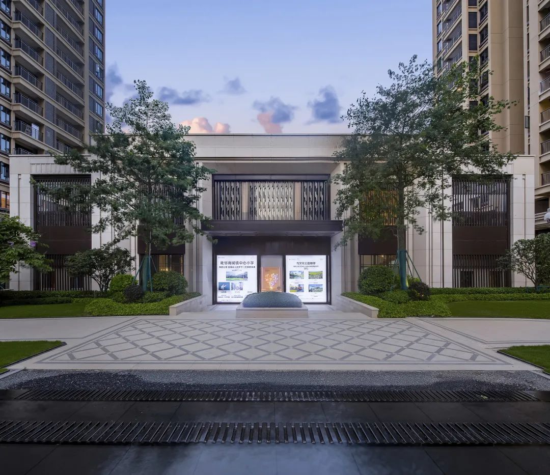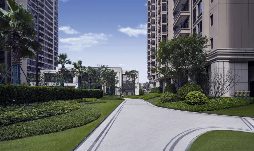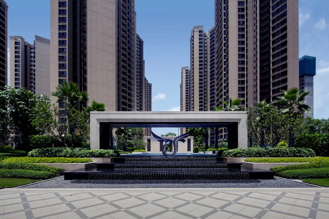 初見海德公館,簡約典雅的迎賓門,是歸家最初的印象,一旁跌落的水景與草坪空間盡顯大宅品質,入口中軸對稱,樹陣迎賓,讓歸家的儀式感達到至高點。