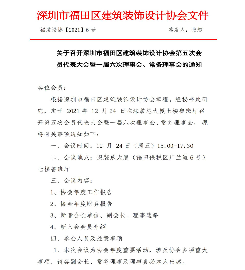 關于召開深圳市福田區(qū)建筑裝飾設計協(xié)會第五次會員代表大會暨一屆六次理事會、常務理事會的通知